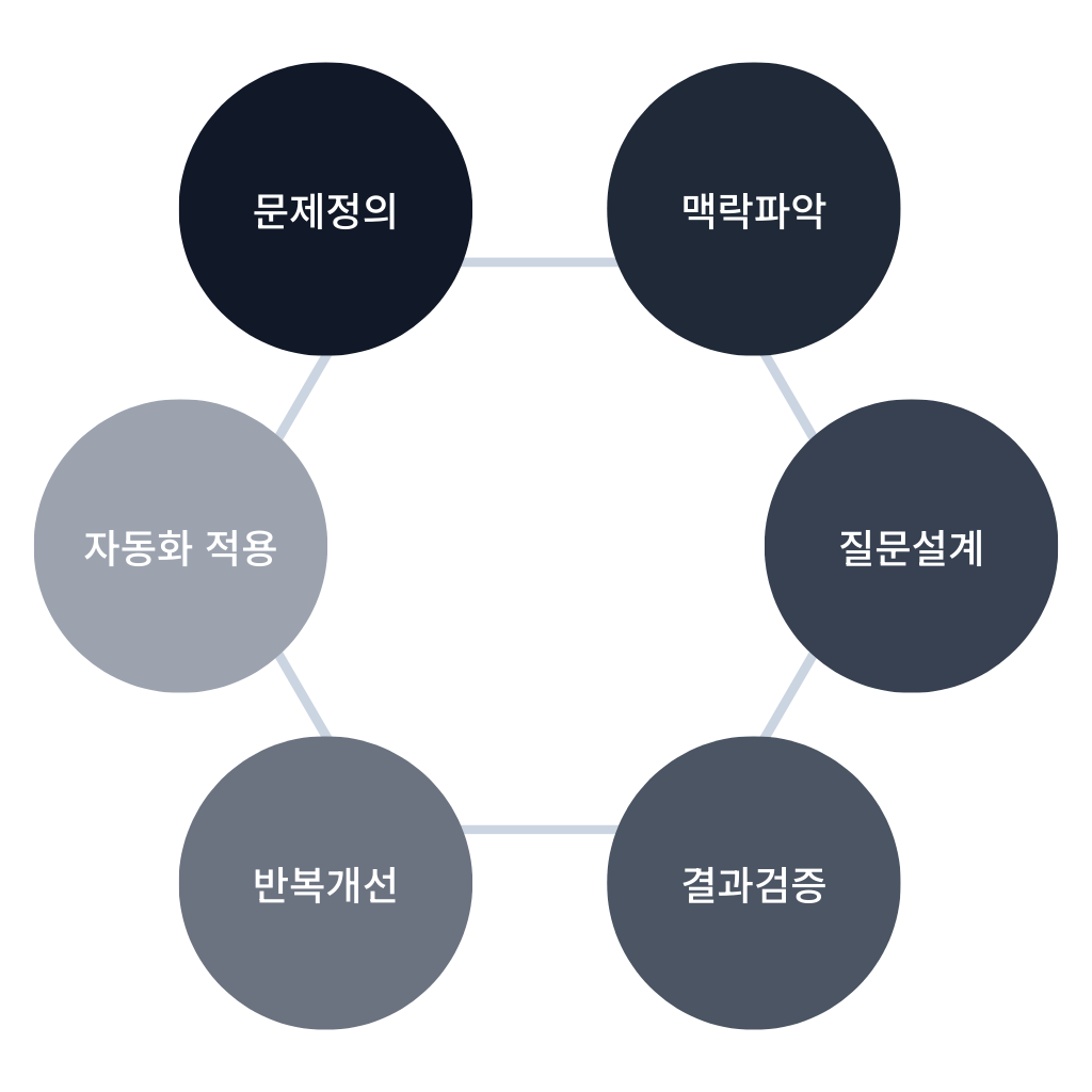 아닙니다. 외우는 프롬프트는 상황이 바뀌면 바로 무너집니다. 우리는 맥락 파악 → 질문 설계 → 결과 검증 → 개선의 흐름을 익혀서, 어떤 업무에서도 스스로 질문을 만들어낼 수 있게 합니다.